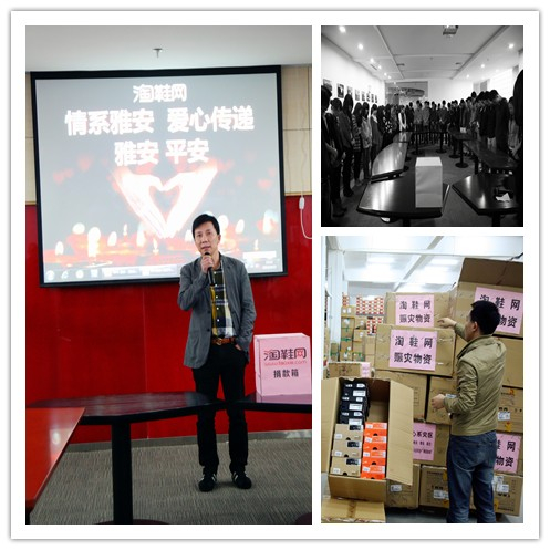 災(zāi)情發(fā)生后幾個小時,淘鞋網(wǎng)迅速反應(yīng),王冬竹董事長立即召集公司全體高管召開緊急大會,指示緊急啟動淘鞋網(wǎng)愛心公益基金支援雅安災(zāi)區(qū),并第一時間對外承諾向雅安捐贈返回