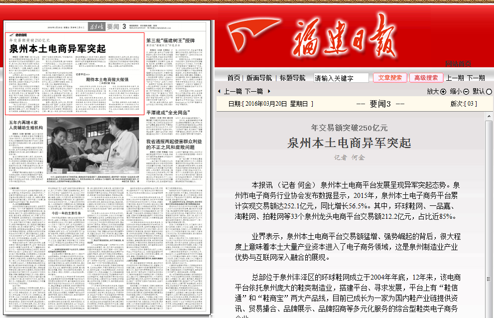 總部位于泉州豐澤區的環球鞋網成立于2004年年底,12年來,該電商平臺依托泉州龐大的鞋類制造業,搭建平臺、尋求發展,平臺上有“鞋信通”和“鞋商寶”兩大產品線,目前已成長為一家為國內鞋產業鏈提供資訊、貿易撮合、品牌展示、品牌招商等多元化服務的綜合型鞋類電子商務企業。
