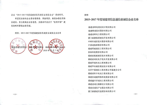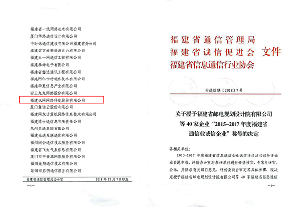 訊網(wǎng)榮獲“2015-2017年福建省信息通信業(yè)誠信企業(yè)”