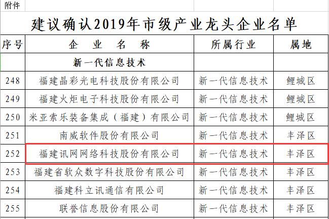 據泉州市工業和信息化局發布的名單公告中,共確認310家企業為2019年市級產業龍頭企業,福建訊網網絡科技股份有限公司(以下簡稱“訊網網絡”)入選“新一代信息技術”行業領域龍頭企業。