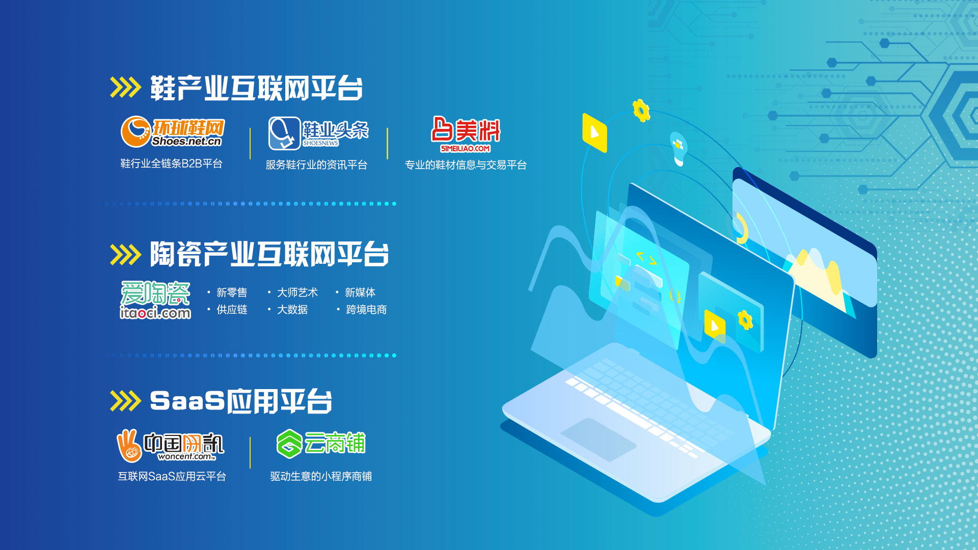 訊網網絡以“互聯網+”為發展基礎,堅持走“特色化”發展道路,以鞋業/陶瓷為試點,加大資源整合和政策注入力度,打造集供應鏈管理、在線采購、整合營銷、供應鏈金融、大數據服務于一體的產業互聯網生態圈樣板,進而有序推動泉州市優勢產業的“產業互聯網”生態圈建設。